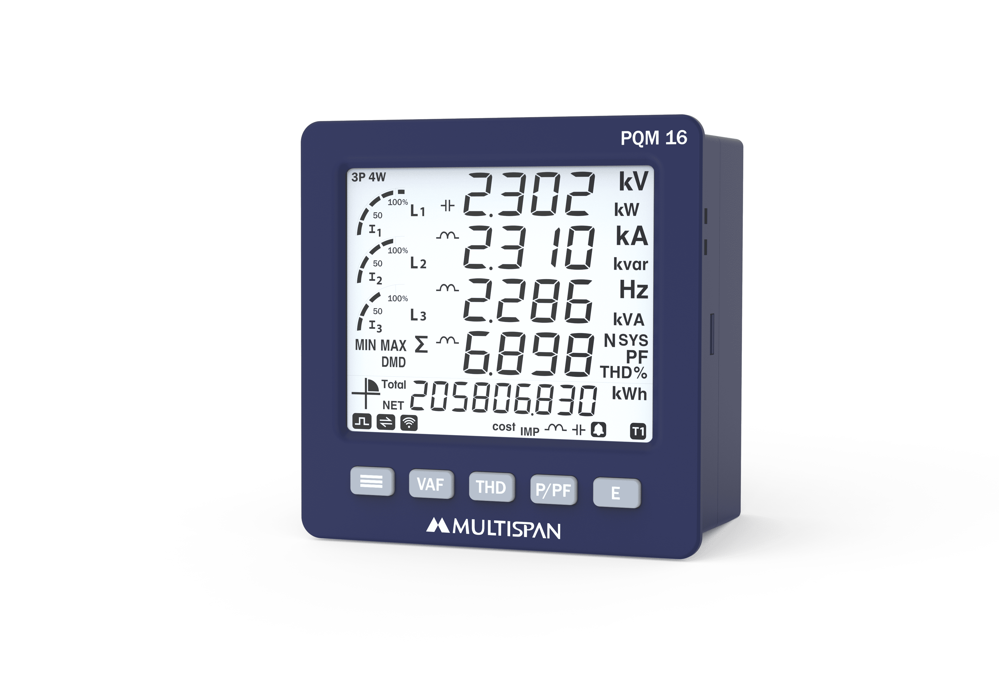 Multispan offers PQM-16 for power and energy measurement for three phase network configuration. Features include harmonics measurement upto 32nd order for power quality monitoring as well.