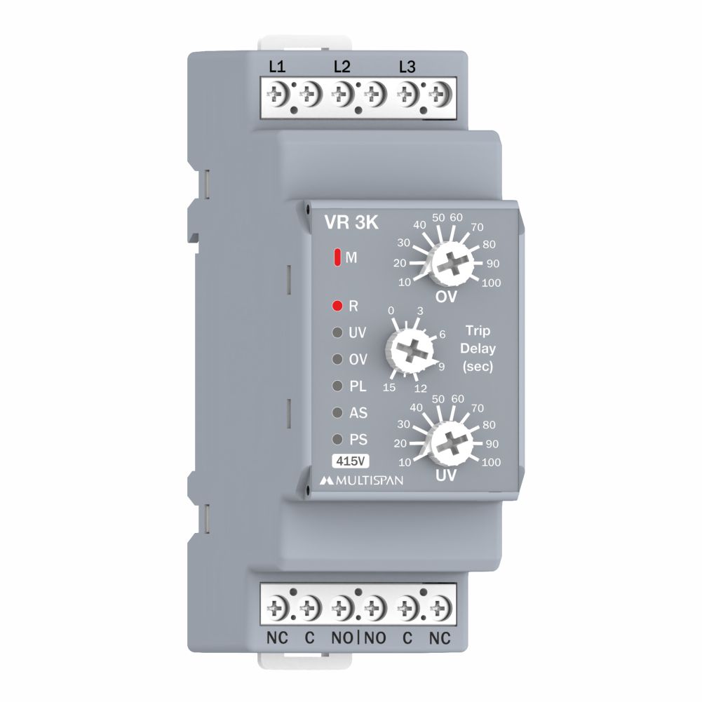 | VR-3K-00 | 90 x 35 x 62.5 | 3Ø-3W | 280V AC to 520V AC | 1-Relay, 2-C/O | Self Powered |